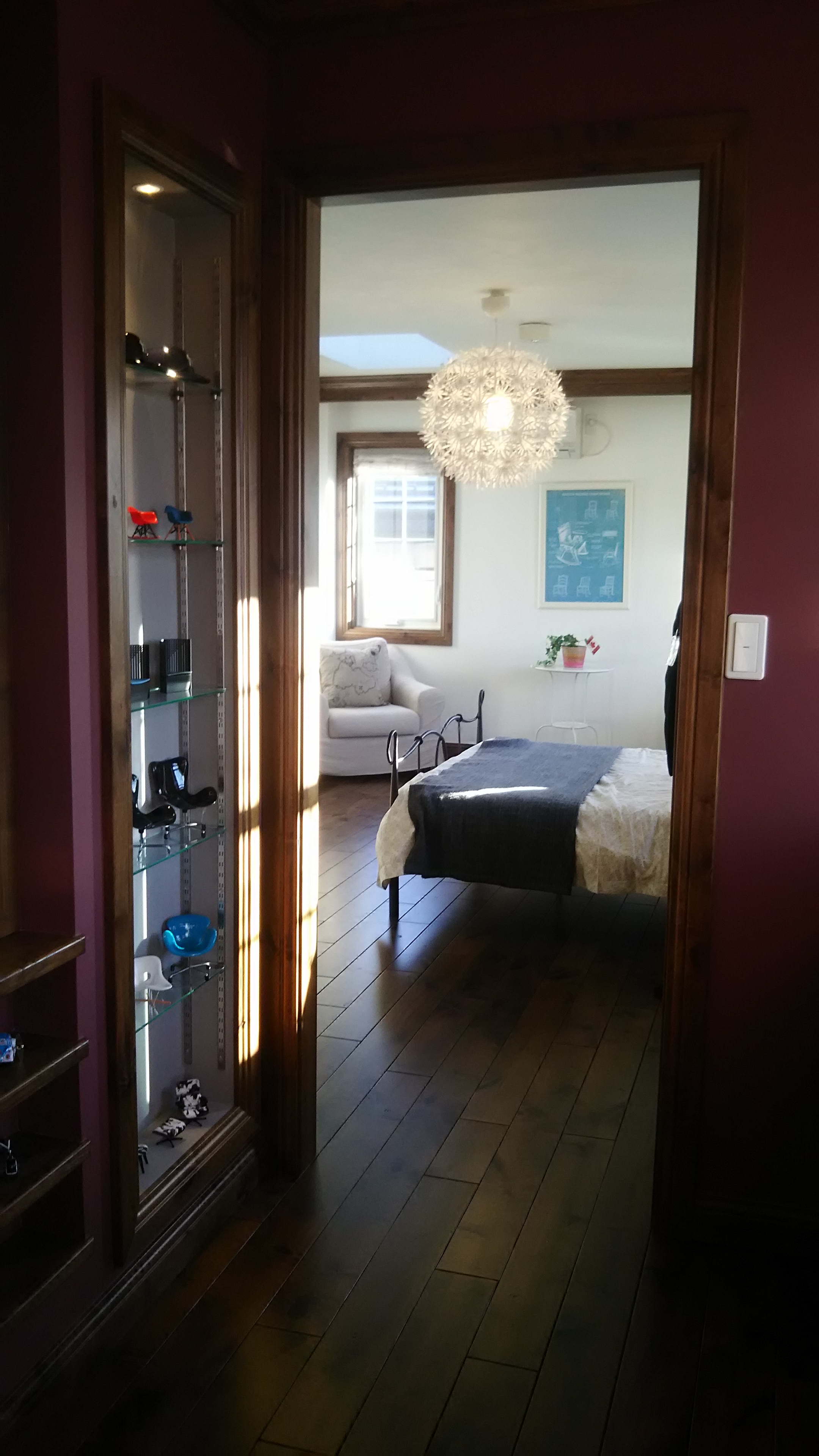 アルダーの床に IKEAの照明器具と アイアンのBedが 素敵な寝室です。